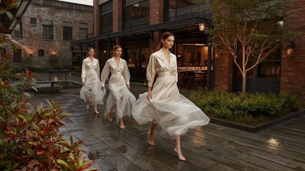 Kurz gesagt: „Luxus auf der Haut“ bedeutet nicht nur glänzend, sondern passgenau — ein Stoff, der den Körper atmet, nicht einschnürt. Seide führt hier das Orchester an, doch Chiffon, Crepe und Organza sind die Harmonisten.